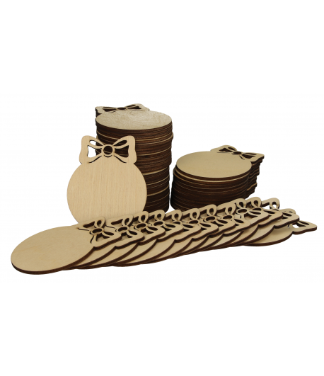 Bombki drewniane z kokardą 2,5x2,0 cm. Wykonane z wysokiej jakości sklejki liściastej grubości 2,5-3 mm.