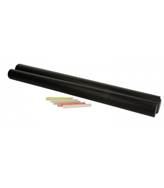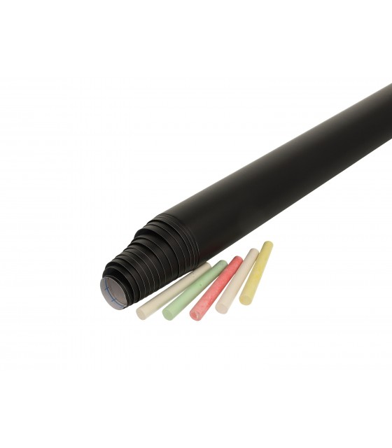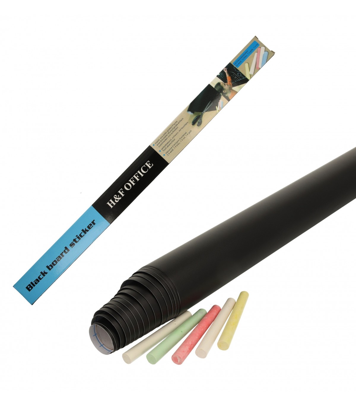 Samoprzylepna tablica w kolorze czarnym. Może być cięta i klejona w dowolnym miejscu, na drzwiach, meblach lodówce itp. Tablicę należy czyścić szmatką. W zestawie tablica o wymiarze 200x45 cm oraz 5 sztuk kredy.