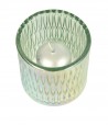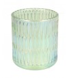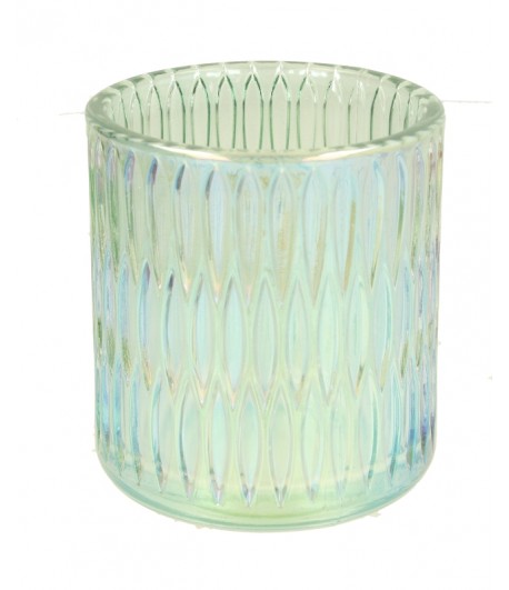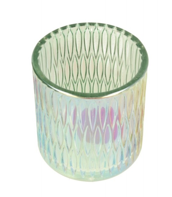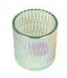 Efektowny świecznik szklany jasnozielony z delikatnym tęczowym połyskiem. Świecznik posiada teksturę w kształcie łezki, dzięki czemu pięknie załamuje światło płomienia.